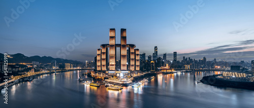 High angle night view of Chaotianmen Wharf in Chongqing, China