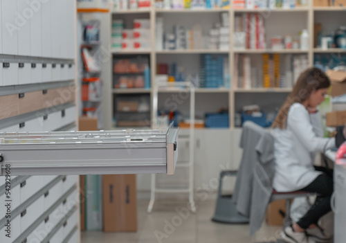 Farmacéutica haciendo un pedido de medicamentos, en el almacén con cajoneras.