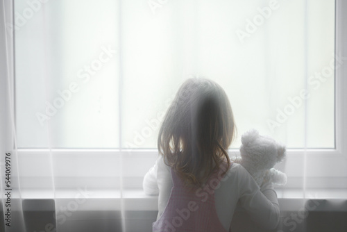 Little girl holding white teddy bear standing alone at window behind transparent day curtains and looking out from home. Rear view. Waiting concept. Close up.