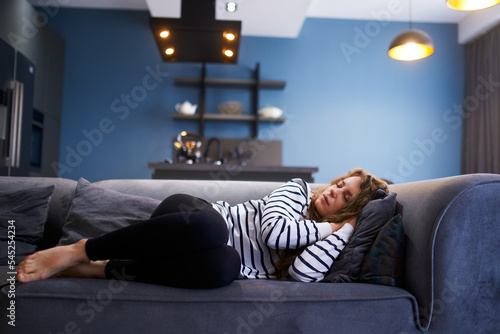 Girl sleeps on cozy sofa in living room at siesta time. Sleeping woman taking nap on the sofa during the day.