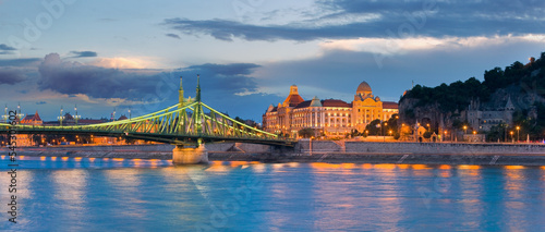 Budapest night view. Long exposure. Hungarian landmarks, Freedom Bridge and Gellert Hotel Palace.