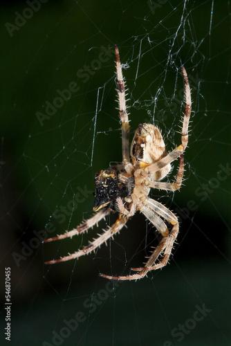 European garden spider eating prey on a web, UK garden