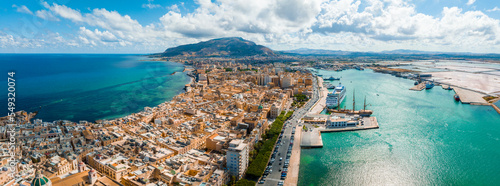 Aerial panoramic view of Trapani harbor, Sicily, Italy. Beautiful holiday town in Italy.