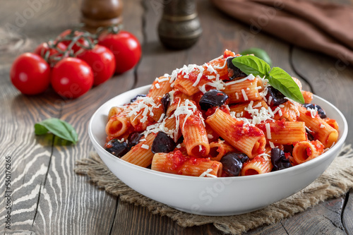 Pasta Alla Norma. Delicious Sicilian pasta dish with roasted eggplant, marinara tomato sauce, grated ricotta and fresh basil served in a white ceramic bowl. Wooden table, selective focus, horizontal.