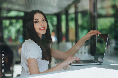 Portrait of beautiful smiling brunette woman sitting in a cafe with laptop outdoor.