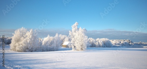 The trees are covered with white frost. Frosty sunny weather. Beautiful winter landscape. Panoramic photography. Latvian landscape.