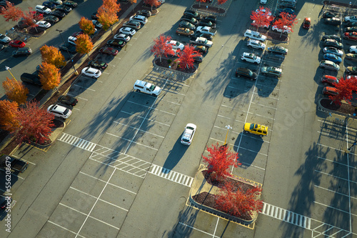 Top view of many cars parked on a parking lot in front of a strip mall plaza. Concept of consumerism and market economy
