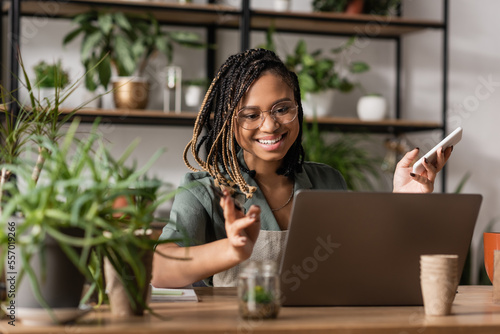 happy african american florist holding smartphone and gesturing during video call on laptop near blurred plants