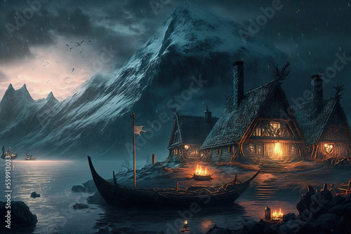 ai generative midjourney illustration of a viking village in a viking landscape by water with northern lights in the dark