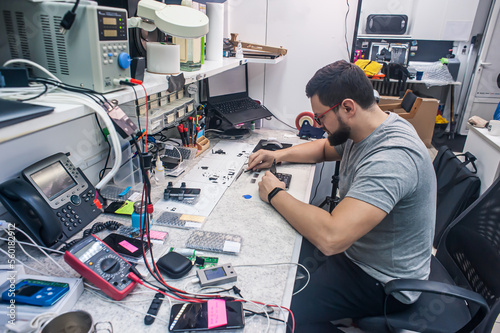 Electronics repair shop, a repairman is surrounded by tools and equipment. A technician repairs, cleans, controls a smartphone. Workplace top view, close-up.
