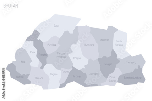 Bhutan political map of administrative divisions - districts. Grey vector map with labels.