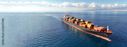 Aerial drone ultra wide photo of huge container tanker ship carrying truck size colourful containers in deep blue open ocean sea