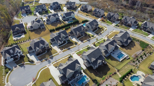 Double cul-de-sac in peaceful subdivision neighborhood row of new development two story house with swimming pool and well trimmed yards suburbs Atlanta, Georgia, USA