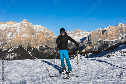 A young man, a happy skier, admires the Italian Dolomites mountains. Skiing, winter sports. Młody mężczyzna, szczęśliwy narciarz podziwia włoskie góry Dolomity. Narty, sporty zimowe.