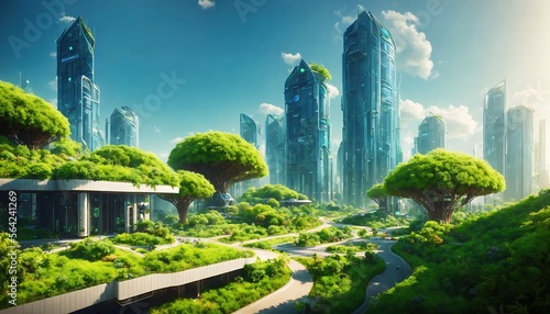 A futuristic eco city utopia plants buildings vegetation - created with Generative AI