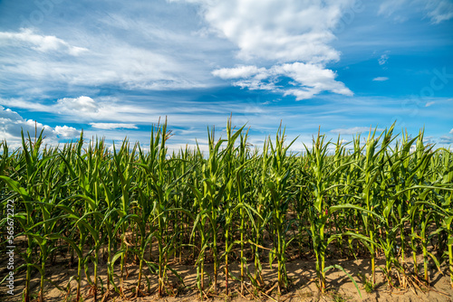zielone pole kukurydzy z błękitnym podobnym niebem w tle