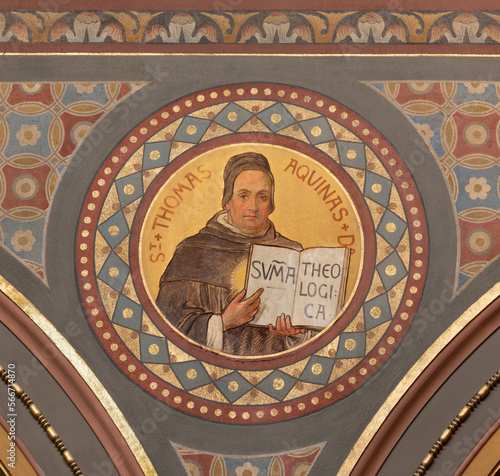 BERN, SWITZERLAND - JUNY 27, 2022: The fresco of St. Thomas Aquinas in the church Dreifaltigkeitskirche by August Müller (1923).