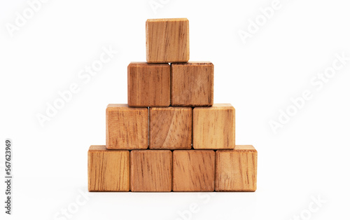 #1280689522Wooden blocks stacked in a pyramid shape on a white background.