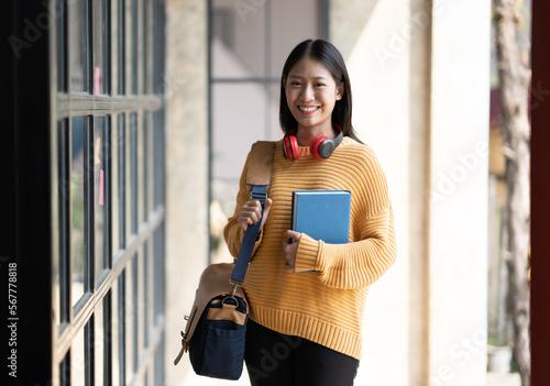 Young Asian Student Standing at Entrance to University Building. Getting rady to go to classroom holding books and bag.