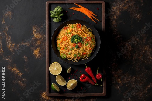 On a dark slate tabletop, there is a dish of spicy, garlicky Hakka noodles. dish from vegetarian Indo Chinese cuisine. Vegetable filled Indian vegan noodles. traditional Asian dish Copy space a top vi