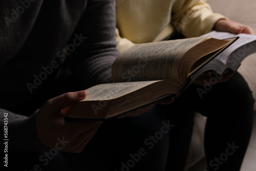 Couple sitting and reading holy Bibles, closeup