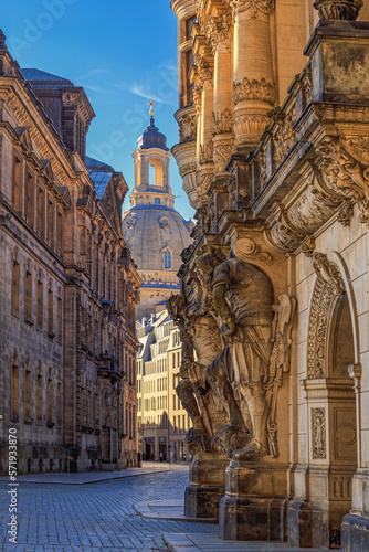 Cityscape - street view with sculptures of gatekeepers on the George Gate of Dresden Castle against the backdrop of the Dresden Frauenkirche, Dresden, Germany