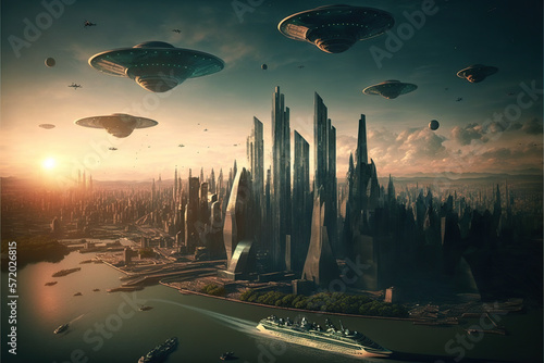 Ilustración de naves espaciales, onis, sobrevolando una gran ciudad, concepto invasión extraterrestre o visita extraterrestre . Generative AI