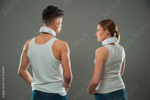 A woman and a man demonstrate an electronic neck massager. Modern technological massager.