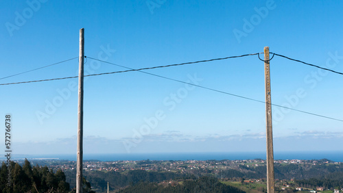 Cables entre poste de madera y hormigón sobre panorámica de casas y horizonte marino