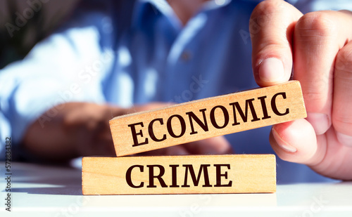 Close up on businessman holding a wooden block with ECONOMIC CRIME message, business concept
