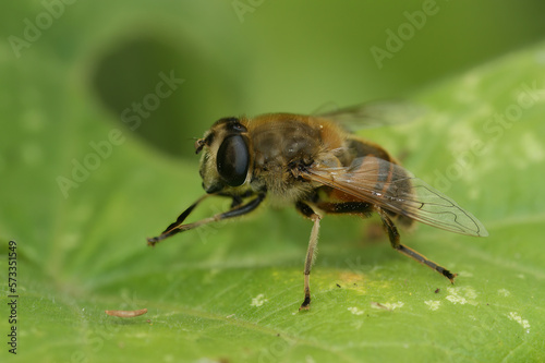 Closeup on a honey bee mimicking dron,e fly, sitting on a green leaf