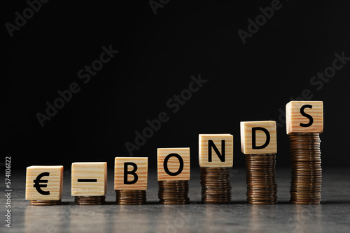 Stacked coins and word Eurobonds made of wooden cubes with letters on grey table