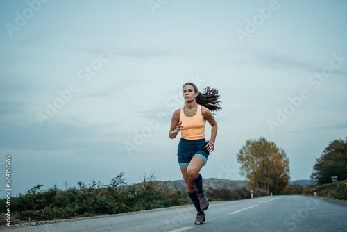 Female athlete with long hair running outdoors early in the morning during her cardio routine.