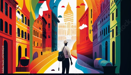 An illustration of a person exploring a new city, with landmarks, people, and colorful streets AI Generated