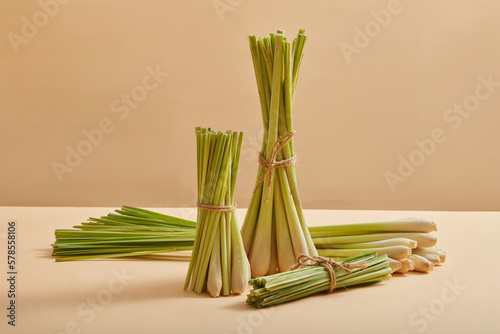 Several bunches of lemongrass (Cymbopogon citratus) are decorated on a pastel background with front view. Lemongrass can be used in cooking or as a herbal to enhance health