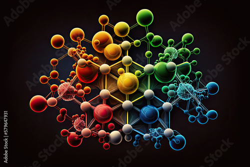 colorful drawing of an abstract complex molecule in red, yellow, blue, and green on a black