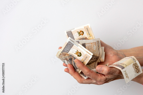 Dłonie mężczyzny i kobiety wymieniających się pieniędzmi. Banknoty na białym tle. Liczenie pieniędzy.