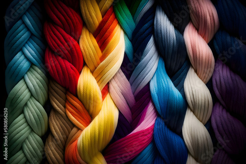 Many colorful Rainbow yarn for knitting. Twisted threads abstract background