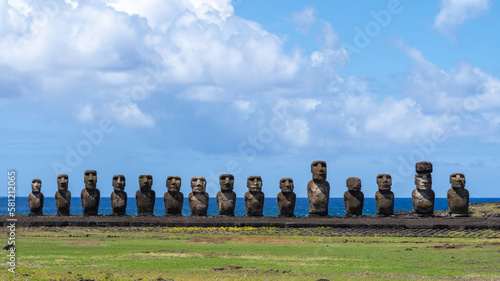 15 moai statues facing inland at Ahu Tongariki in Rapa Nui National Park on Easter Island (Rapa Nui), Chile. Restored in the 1990s, Ahu Tongariki is the largest ahu on Easter Island.