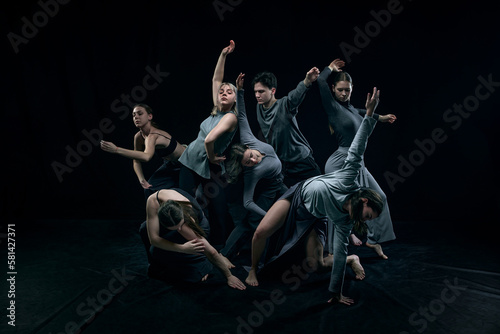 Flexibility. Group of young people expressively dancing against black studio background. Concept of modern freestyle dance, contemporary art, movements, hobby and creative lifestyle