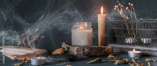Tarot, astrology,Esoteric, Occult mystical ritual scene of sorcery tarot candles,dried flowers, palo santo tarot cards, ritual book.Witchcraft,mysticism and occultism,esoteric background,tarot banner