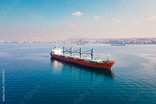 Bulk carrier or bulker anchored nearby port waiting uploading, Aerial wide shot