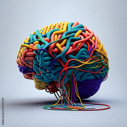 brain covered with colorful wires seam dressing dexterity handmade smart technology network colored cables ropes vascularr intellect human head intelligence connection Generative AI
