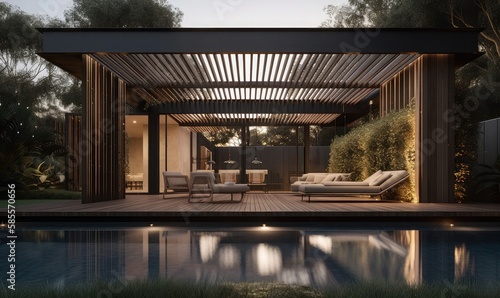 Wooden terrace with sofas and sun loungers by the pool, generative AI