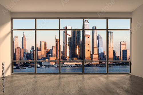 Midtown New York City Manhattan Skyline Buildings from High Rise Window. Beautiful Expensive Real Estate. Empty room Interior Skyscrapers View Cityscape. Sunset. Hudson Yards West Side. 3d rendering