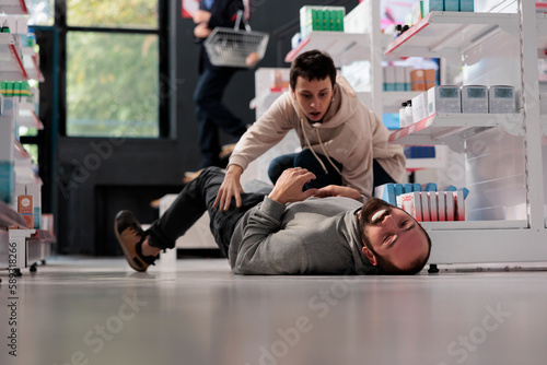 Terrified woman noticing man on drugstore floor having epileptic seizure, running to give first aid for fainting. Apothecary client helping person suffering from epilepsy disorder attack