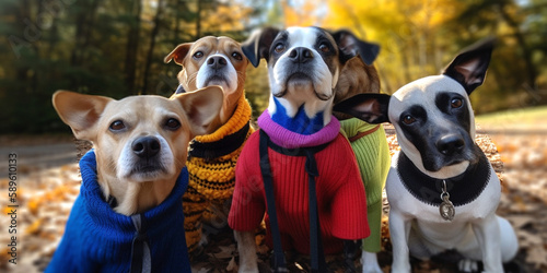 fünf Hunde mit bunten Pullovern im Park, generative AI