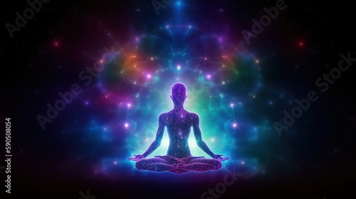 Meditating human silhouette in yoga pose. Galaxy universe background. Colorful chakras and aura glow. Meditation on outer space background with glowing chakras. Esoteric.