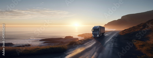 Truck on the road with sunset above the sea at background. Delivery, transport concepts. Created using generative AI tools