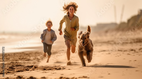 Beautiful sisters running on the beach sand with her cute dog. Generative AI